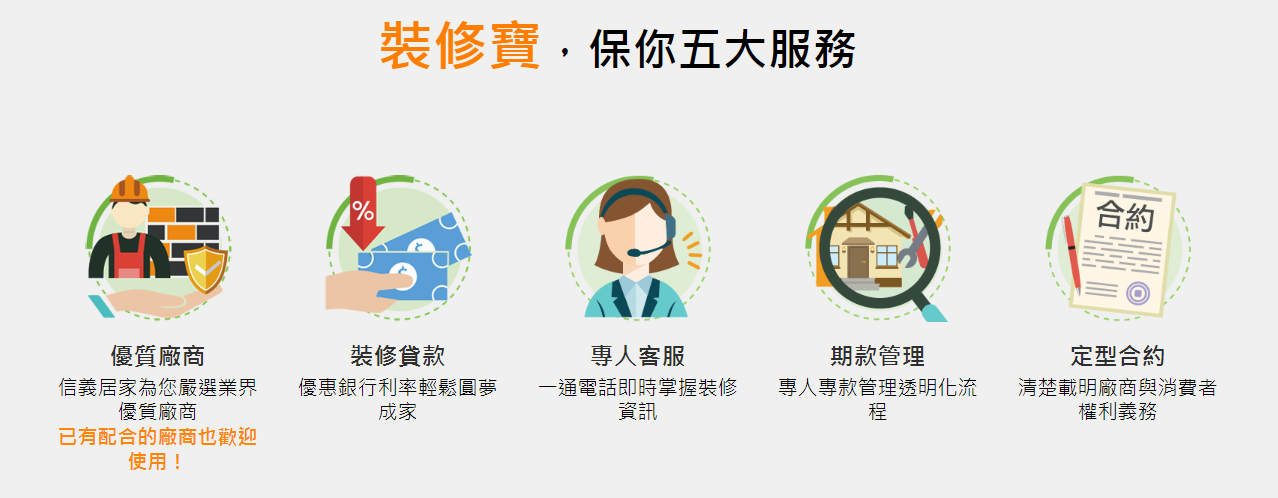裝修寶還可搭配信義居家嚴選業界優質廠商、專屬優惠銀行利率輕鬆裝修、專人專款管理透明化以及定型合約清楚載明權利義務等,五大服務幫助您安心打造夢想中的家!